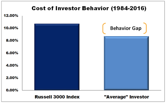 “It appears investor behavior, while providing short-term relief by appeasing momentary emotions, has a cost of anywhere between 2% and 4% (or more) in a given year. There are lots of reasons why investors perform poorly, but the bottom line is that many