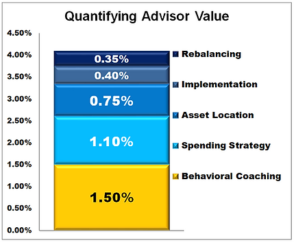 An advisor can add 2.25– 4.1% annually. A Vanguard study identified behavioral coaching as adding 1.50% per year on average. They identified 4 other areas where having an advisor adds value.